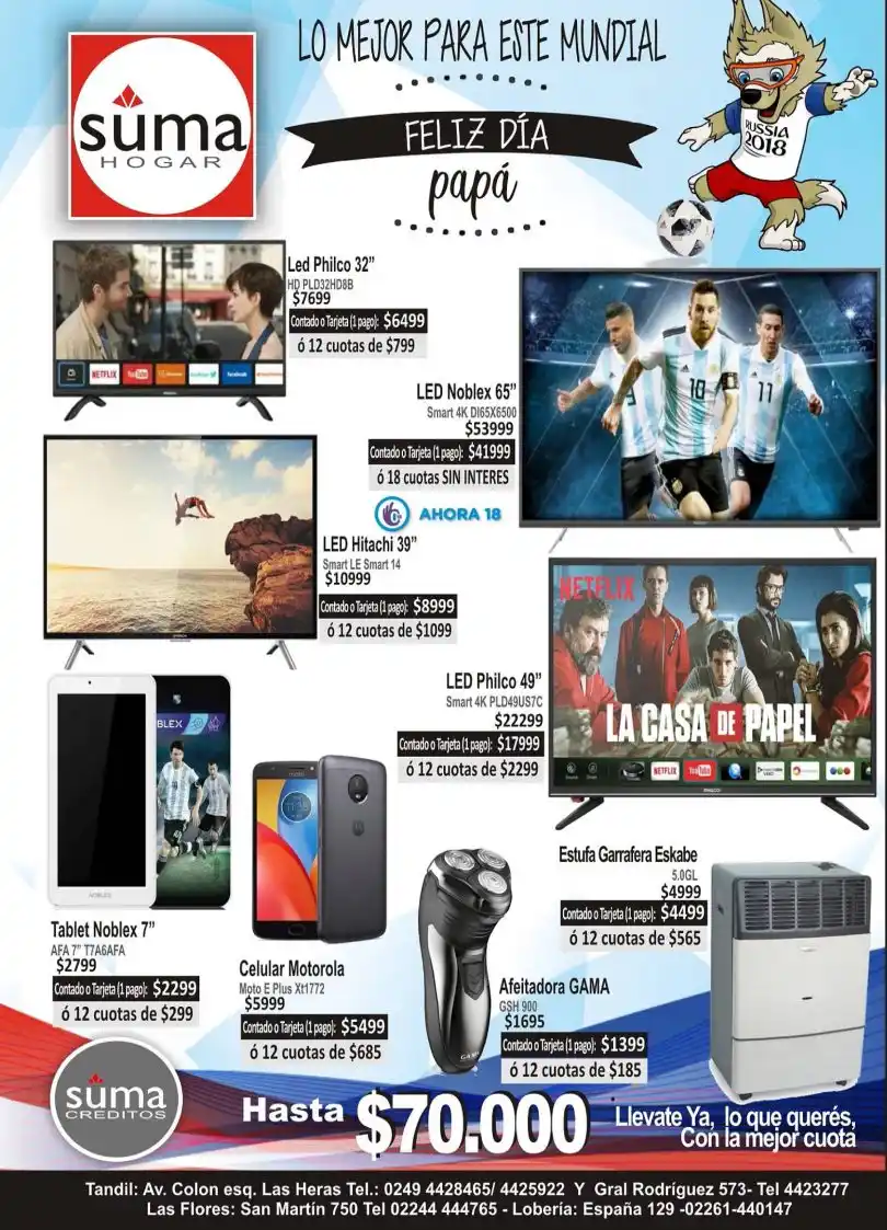 En Suma Hogar vas a encontrar hasta este domingo los mejores precios y descuentos en LED, Celulares, Tablets y mucho más. Llevate todo lo que quieras para papá y todo lo que quieras para empezar a Vivir Rusia 2018.