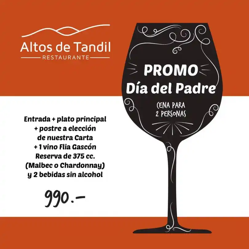 – Entrada + plato principal + postre a elección de nuestra Carta. + 1 vino Flia Gascón Reserva de 375 cc (Malbec o Chardonnay) y 2 bebidas sin alcohol: $990.-