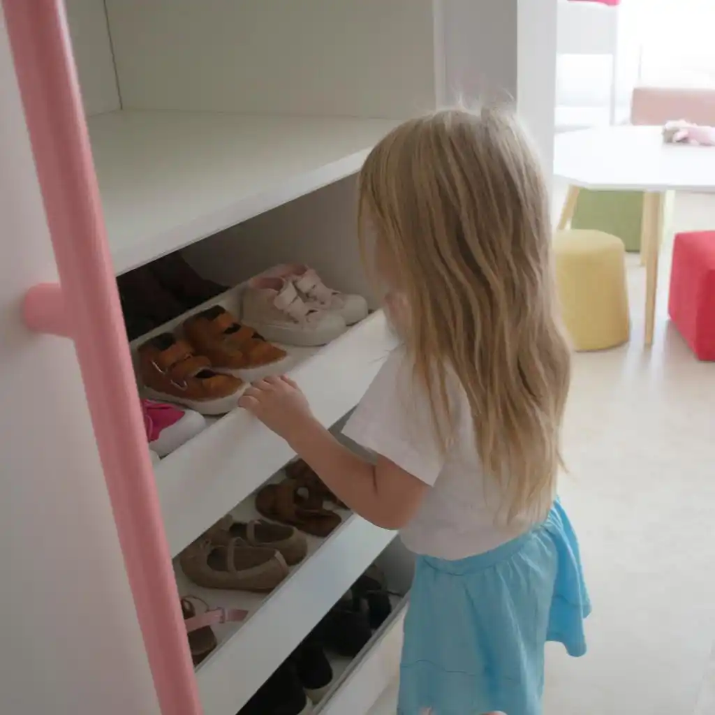 ⁃Respecto a la ropa, lo más adecuado será un armario simple, con espacio de colgado y estantes o cajones al alcance de los niños, que propicie su participación activa en su uso. Una buena práctica es que los chicos doblen y guarden su ropa y celebrarlo con ellos, aunque luego, en su ausencia, debamos nosotros emprolijar la misma.