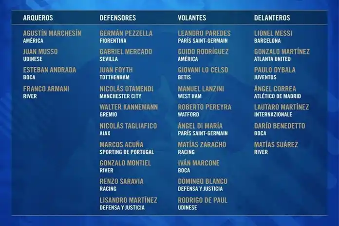 Otro punto a destacar es la alternativa de citar a cuatro arqueros para disputar solo dos encuentros. Entre ellos, aparece por primera vez el nombre de Juan Musso, ex arquero de Racing, hoy en el Udinese de Italia.