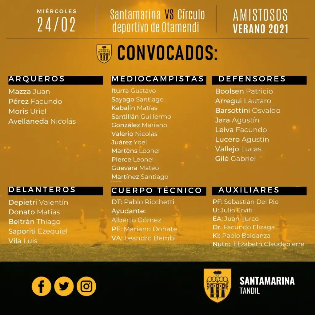 El Club Santamarina afrontará este miércoles por la tarde, en el Estadio San Martín, su segundo amistoso de pretemporada, en esta ocasión ante Círculo Deportivo de Nicanor Otamendi, conjunto que milita en el Torneo Federal A.