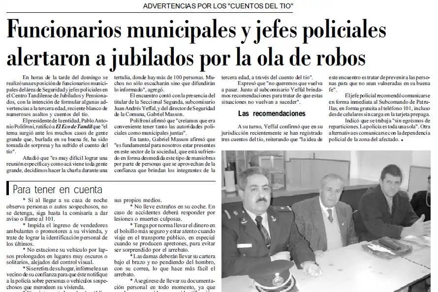 Accedé a las últimas noticias desde tu emailSe realizó una exposición de funcionarios municipales del área de Seguridad y jefes policiales en el Centro Tandilense de Jubilados y Pensionados, con la intención de formular algunas advertencias a la tercera edad, reciente blanco de numerosos asaltos y cuentos del tío.