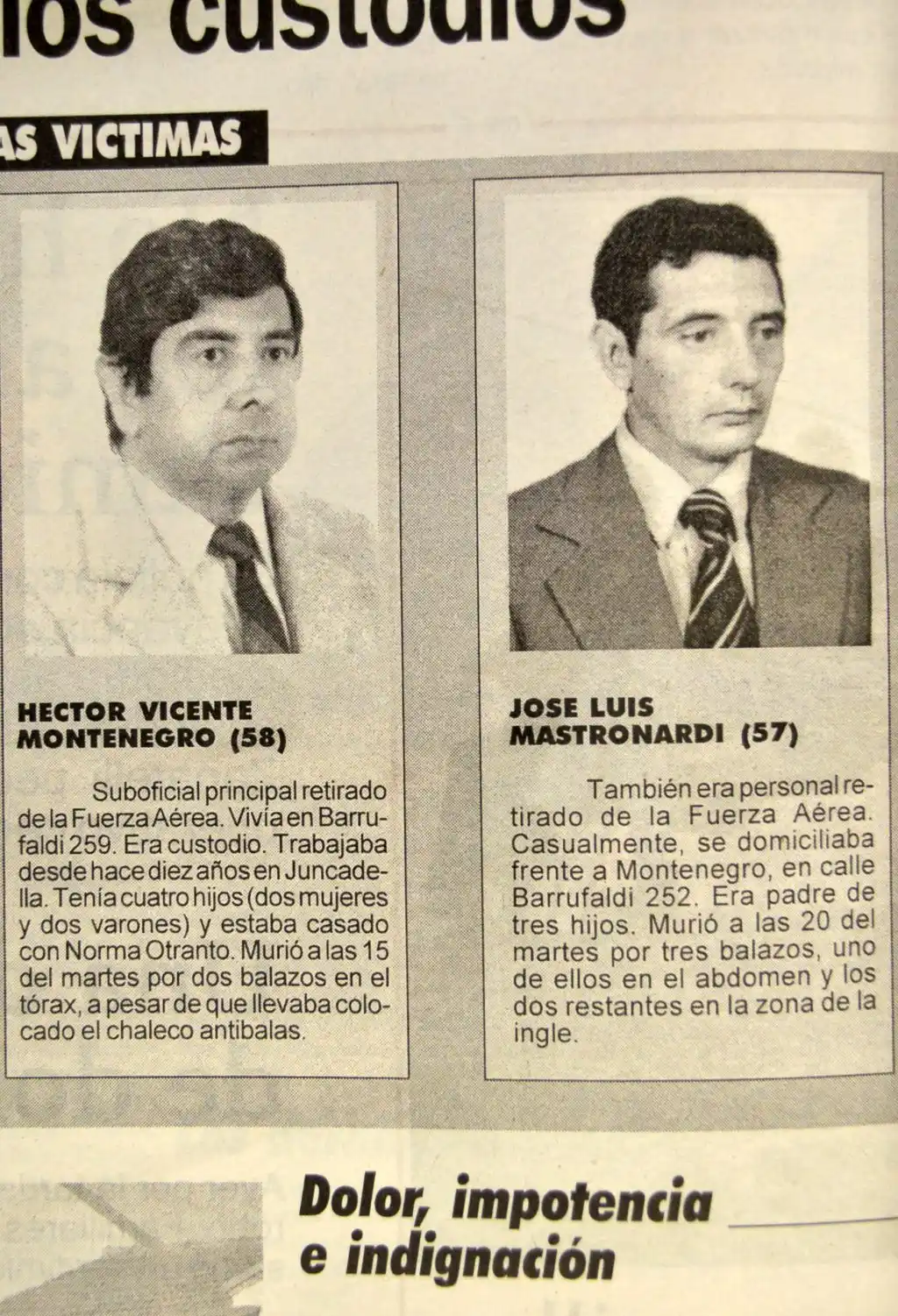 Accedé a las últimas noticias desde tu emailEn pleno mediodía, cinco sujetos con armas de grueso calibre acribillaban a dos custodios de la empresa de caudales Juncadella, en un cajero de la estación de servicio Don Rodolfo, de Perón y Monseñor de Andrea, delante de una veintena de vecinos que a la postre serían los testigos presenciales –y fundamentales para la posterior pesquisa- de una balacera descomunal que terminó con la vida de José Luis Mastronardi y Héctor Montenegro, cuyo deceso dejó a dos familias destruidas y una comunidad atónita frente a semejante suceso delictivo.