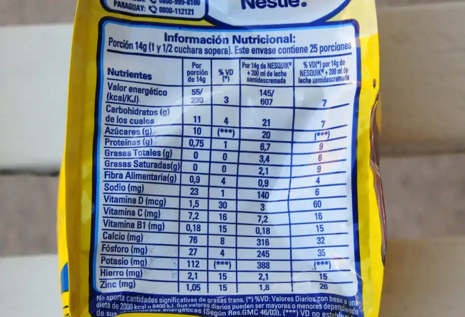 Es toda descripción destinada a informar al consumidor sobre las propiedades nutricionales de un alimento. La información nutricional debe ser expresada por porción, incluyendo la medida casera correspondiente, y el porcentaje de Valor Diario (%VD). Adicionalmente, la información nutricional puede ser expresada por 100g o 100 ml. Las cantidades mencionadas deben ser las correspondientes al alimento tal como se ofrece al consumidor.