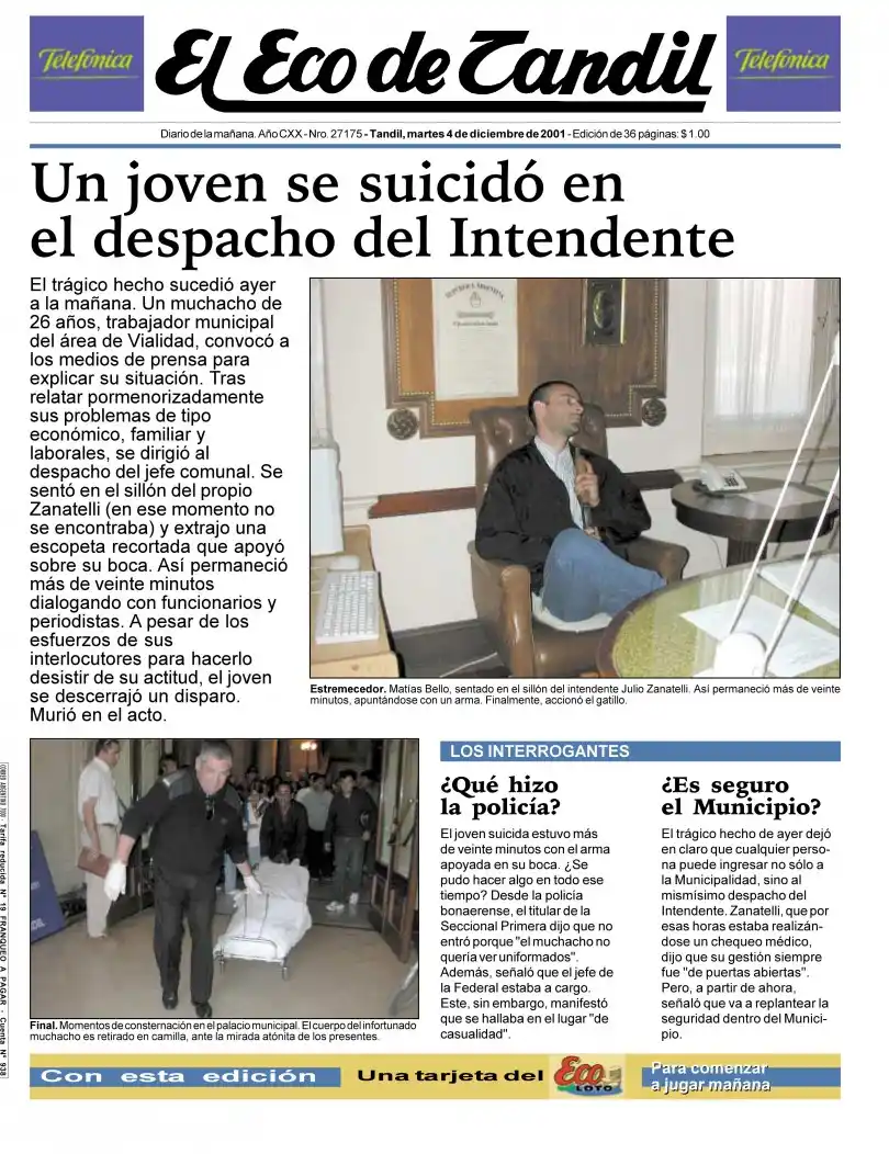 Accedé a las últimas noticias desde tu emailFue así como Bello se levantó de su sitio y se dirigió hacia el despacho del intendentente, que en ese momento se encontraba ausente a causa de un chequeo médico. Sin titubear, ingresó y se sentó en el sillón de Zanatelli. Se bajó el cierre de la campera, extrajo una escopeta del 12 recortada y se la colocó en la boca. En ese momento, el secretario privado del Intendente, Carlos Capodicci, se sentó frente a él en un intento desesperado de calmarlo. Estaba al tanto de la situación, de las deudas, de la falta de trabajo de Bello, quien se lo había contado antes de tomar su última decisión. Sin embargo, Bello no cedió: “Aunque me digas: ‘loco, te damos el edificio de acá en frente’, no hay marcha atrás”.