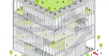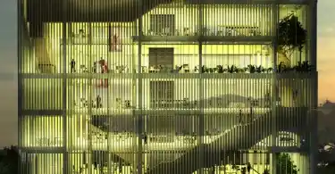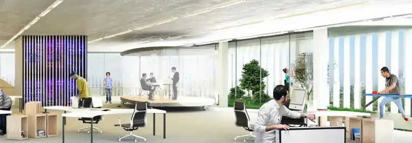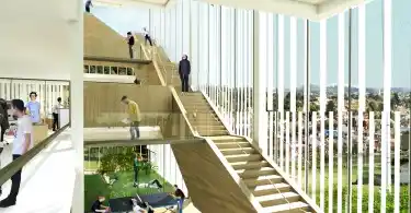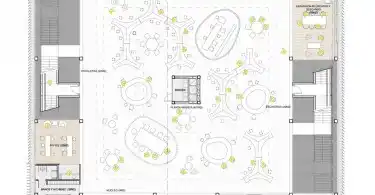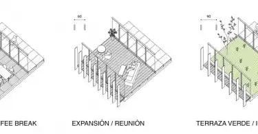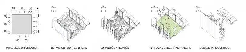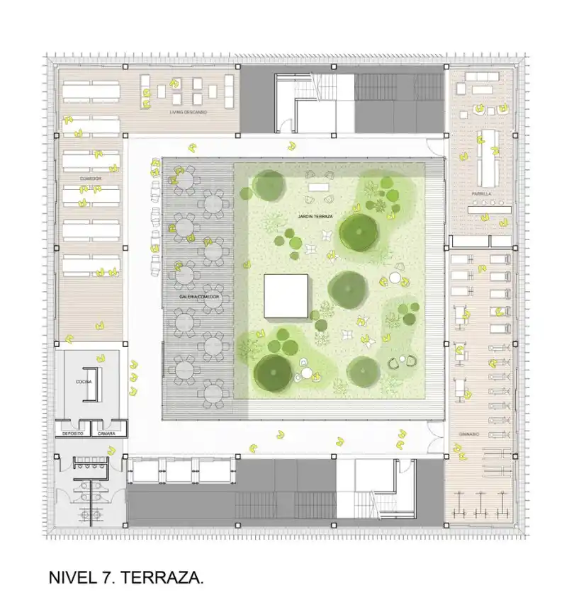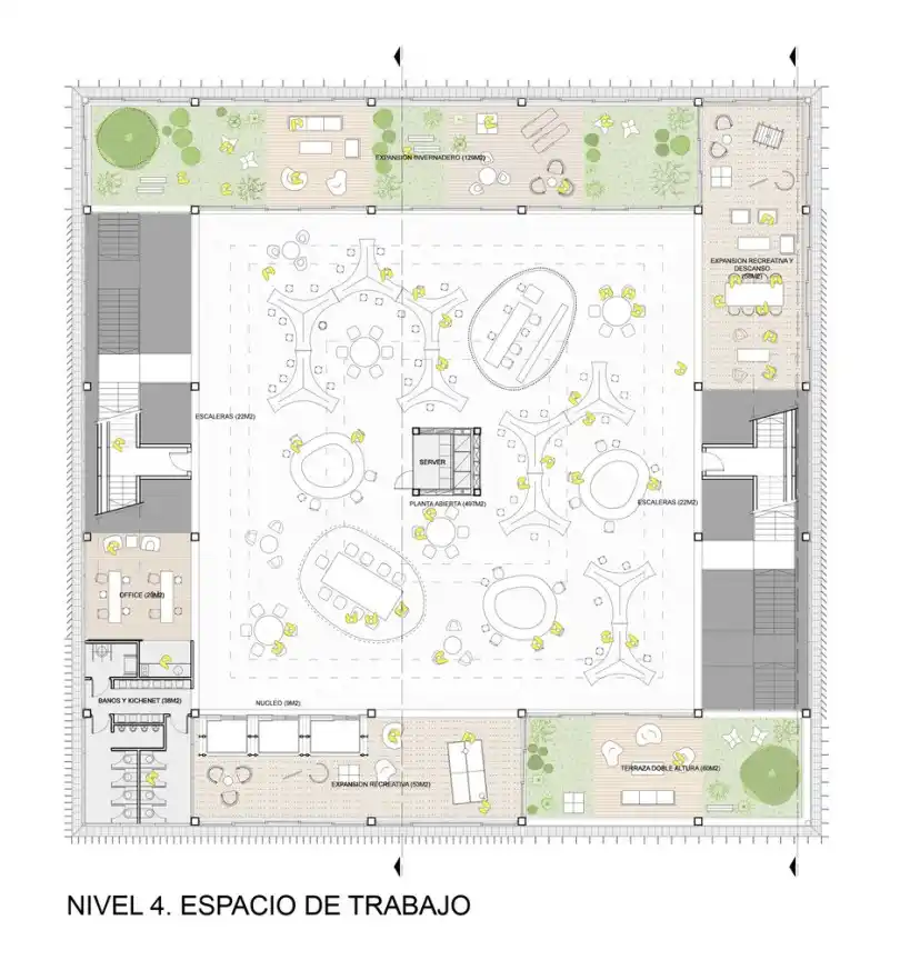 Bordeando las Plantas Abiertas de trabajo se encuentra el programa de usos que las complementa, tanto los servicios, baños, espacio de Coffee Break, de reunion, relax, juegos, terrazas vegetadas, invernaderos, escalera de incendio y la escalera de recorrido. Este anillo vincula todos los niveles de forma física, con la escalera que envuelve el edificio, y visual con los invernaderos y terrazas en doble altura, promoviendo así el encuentro de los usuarios en espacios de calidad.