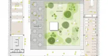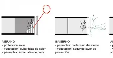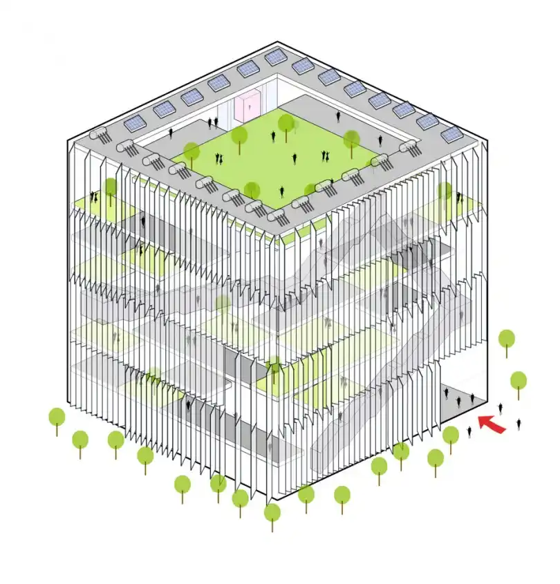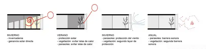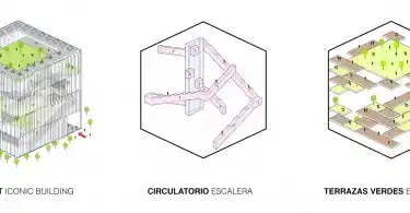 El edificio se retira de la Linea Oficial, ampliando y mejorando la situación de ingreso desde una calle esbelta. La transparnecia de la fachada también juega un papel importante en la comunicación edificio-comunidad, demostrando variedad de usos y funciones como expansiones, espacios verdes, invernaderos, servicios y una escalera que envuelve el edificio proponiendo un recorrido dinámico que atraviesa distintas situaciones, visuales y sensaciones para vincular todos los niveles. La planta baja libera el perímetro ofreciendo más posibilidades de organización para futuros usos y la terraza concentra actividades de recreación y relax al rededor de un parque de variadas especies vegetales autóctonas.