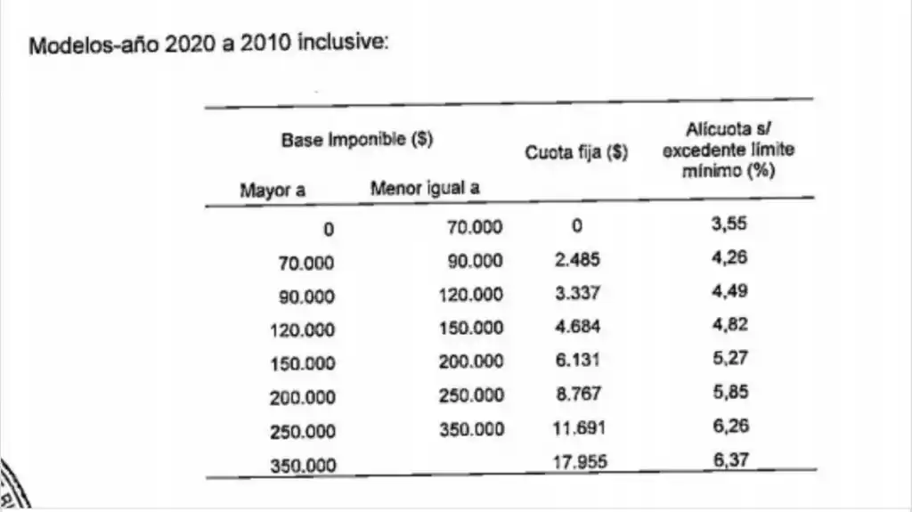 - Con esa base imponible, debés fijarte en qué categoría se posiciona tu vehículo en la tabla que te dejamos en la parte inferior. A la valuación debés restarle la base imponible que corresponda a una categoría inferior.