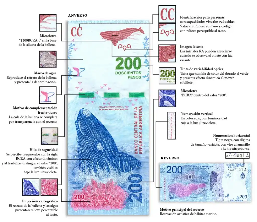 - Microletra: “$200BCRA” en la base de la silueta de la ballena.
