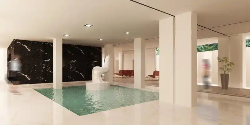 Un hall con sillones y grandes lámparas para cada bloque de departamentos, cajas de ascensores intervenidas con espejos y murales en madera laqueada, rincones para disfrutar, cubos de espejo y otros de madera laqueada blanco y negro ubicados en distintas posiciones para un detalle decorativo y el primer aporte al arte en el edificio, tres pequeñas esculturas en granito de Marcelo Bondi, un cuadro de Tito Kabhie en tono azul acompañando a la gran protagonista del edificio, una escultura cuya instalación fue montada sobre el espejo de agua central, estructura de la memoria, Brote Boreal de Guillermo Vezzosi, hacen del espacio de la planta baja, sea de día o de noche con sus múltiples efectos lumínicos, un lugar de observación permanente, relax y disfrute de emociones.