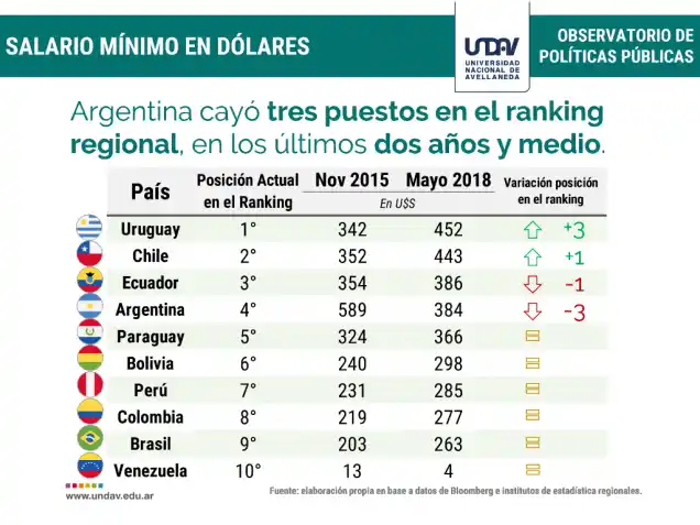 Accedé a las últimas noticias desde tu emailAsí surge del informe semanal del Observatorio de Políticas Públicas de la Universidad Nacional de Avellaneda (Undav), que muestra una caída abrupta. En noviembre de 2015 el salario mínimo en el país era de 589 dólares, hoy es de 384.