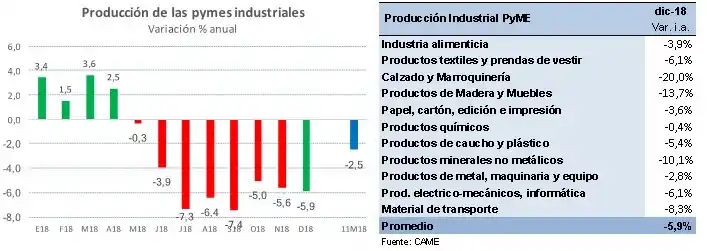 La producción de las Pymes Industriales cayó 5,9% en diciembre último frente a igual mes del año 2017. De esta manera, cerró 2018 con un descenso de 2,5%. La industria creció 1,2% anual en el primer semestre y cayó 6,1% en el segundo.
