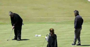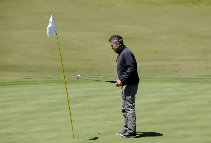 Amablemente, saludó a la prensa y arrancó el carro que conducía junto a su esposa para continuar con la distendida vuelta de golf, lejos de las tensiones que vivirá en el partido, ya no amistoso, camino al balotaje.