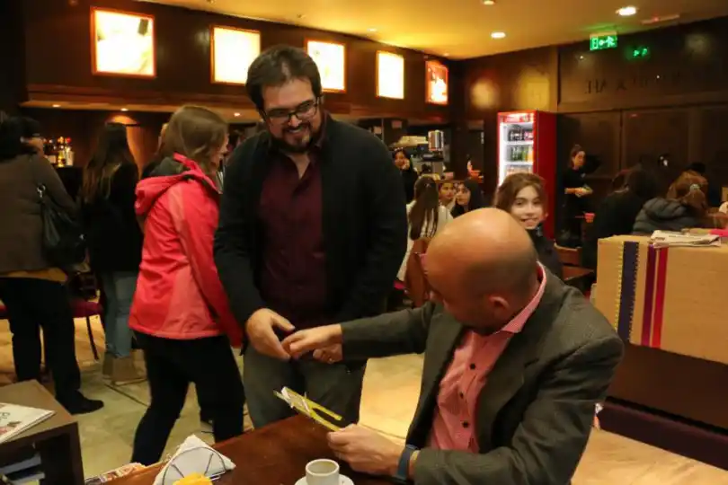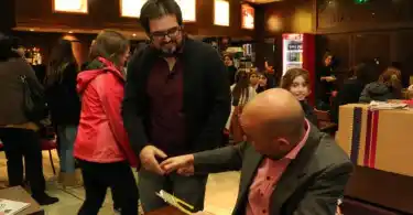 Continúa siendo el hombre sencillo y afable que conocimos ya hace tiempo en una edición de la Feria y a la que luego volvió en otras oportunidades. Lo encontramos en el bar de la Uni, autografiando los libros que sus muchos lectores llevaron. Más tarde, luego de la charla en el Auditorio Alfa, Eduardo Sacheri continuaría dedicando ejemplares a sus innumerables lectores.