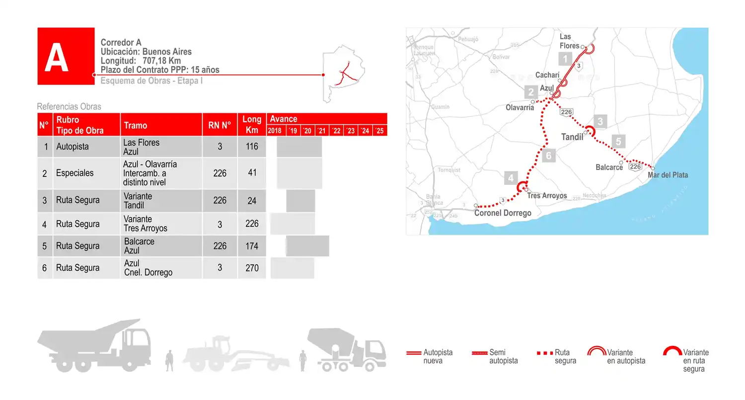 El nuevo corredor vial A esta conformado por la Ruta Nacional N° 3, desde el Km. 183 (Las Flores), hasta el empalme con la RP N° 72, en la ciudad de Coronel Dorrego, y por la Ruta Nacional N° 226, desde la Km. 0, hasta el Km. 300 en la ciudad de Olavarría. Este corredor posee una extensión de Km. 707,18.