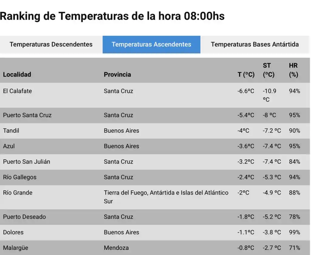 Accedé a las últimas noticias desde tu emailSegún datos del Servicio Meteorológico Nacional, Tandil registró a las 8 de este jueves una temperatura de -4 ºC y una sensación térmica de -7,2ºC, siendo la tercera localidad más fría del país, detrás de dos ciudades de la provincia de Santa Cruz.