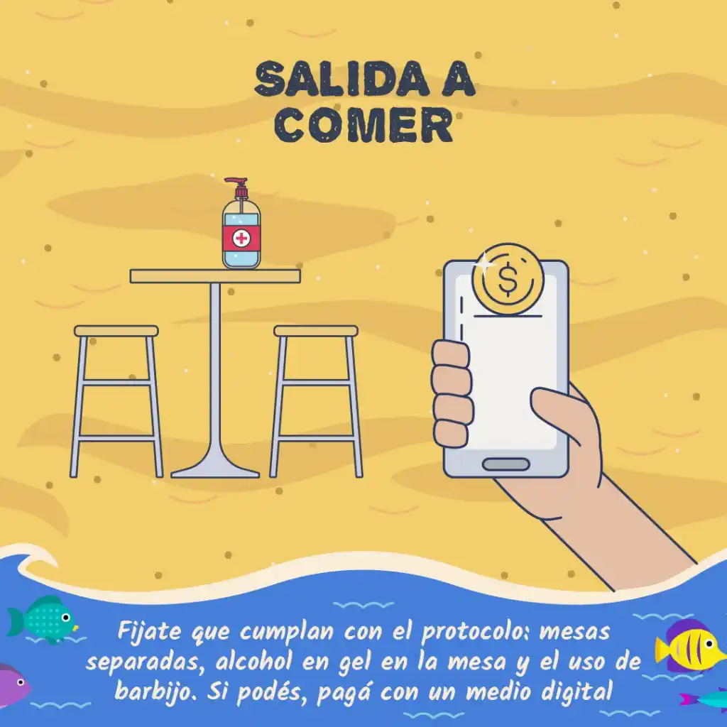 Cuando vayas a comer afuera evitá compartir vasos, platos y cubiertos. Priorizá el pago a través de medios electrónicos y pedí el menú digital o en cartelera, evitando contacto.