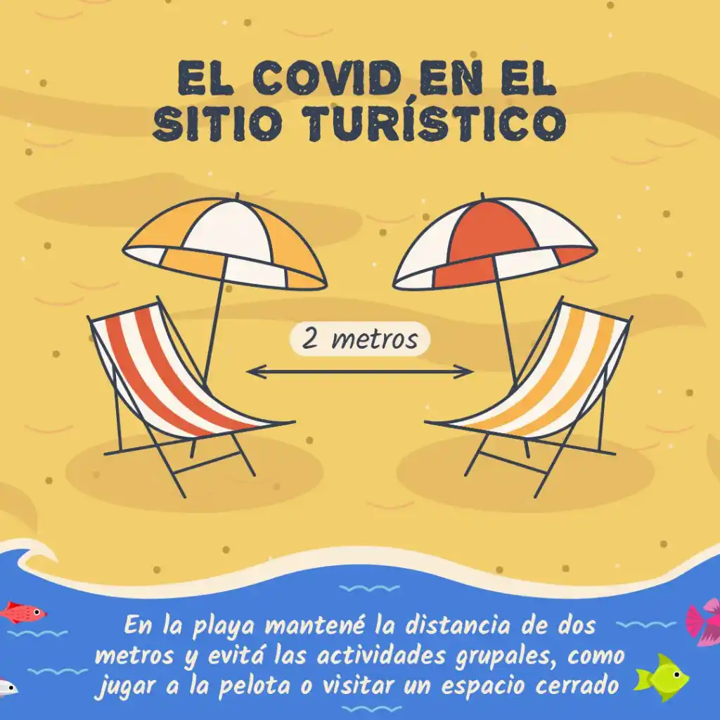 En la playa, el río o la montaña, colocá tus objetos personales (toallas, reposeras y otros) con distanciamiento de 2 metros. Si practicás deportes, que sean individuales manteniendo la distancia: no hagas actividades grupales.