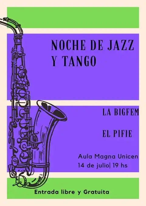 Accedé a las últimas noticias desde tu emailA cargo de La Bigfem y El Pifie, se llevará a cabo hoy, desde las 19, el show denominado “Noche de Jazz y Tango”. La cita es en el Aula Magna de la Unicen, situada en Pinto y Chacabuco. La entrada es libre y gratuita.