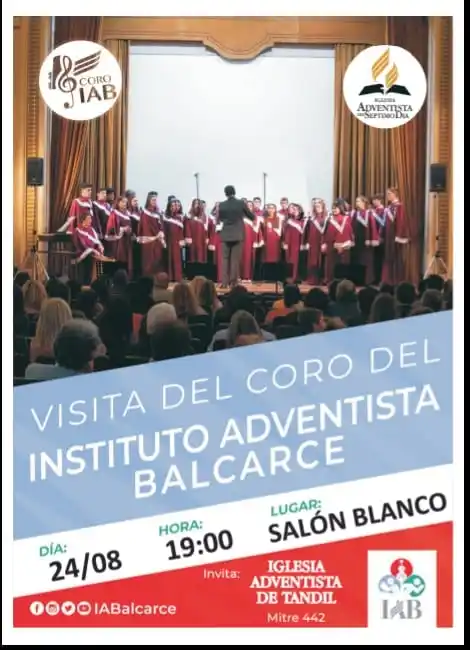 El sábado 24 de agosto a las 19, en el Salón Blanco Municipal (Belgrano 485), se presentará el Coro del Instituto Adventista de Balcarce, agrupación formada por jóvenes que interpreta canciones de diversos estilos. La entrada será libre y gratuita, abierta a toda la comunidad.