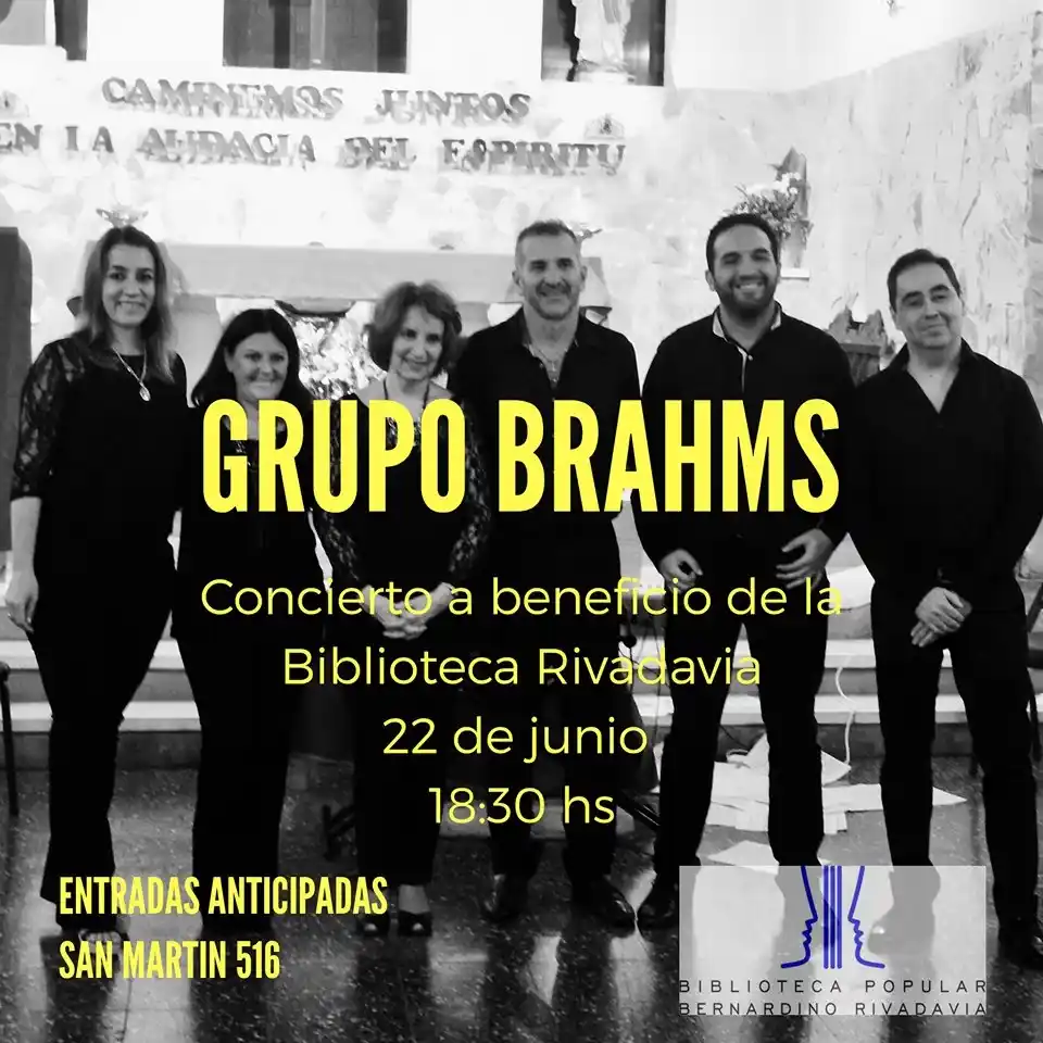 En el día de hoy a las 18.30 en la sala principal de la Biblioteca Rivadavia (San Martín 516), se presentará el Grupo Brahms. El concierto es a beneficio de la Biblioteca y ya están disponibles las entradas a un valor de 200 pesos. Canciones y valses de amor. Magalí Balstieri (soprano). Nora Aranaz (contralto). Matías Rodríguez (tenor). Claudio Lezcano (barítono). Lucy Fava y Claudio Rondina (piano). José Ángel Paz (narrador). Invitado especial: Marcos Paz (violín).