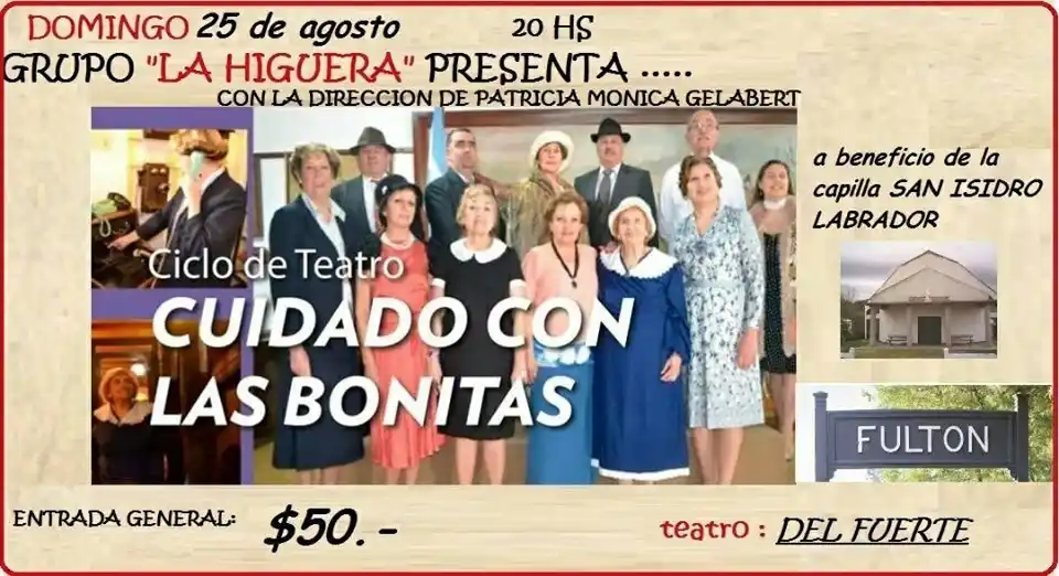 Este domingo 25 desde las 20, en el Teatro Municipal del Fuerte (Fuerte Independencia 360), el grupo La Higuera con dirección de Patricia Mónica Gelabert pondrá en escena la obra “Cuidado con las bonitas”, una propuesta para toda la familia, a beneficio de la Capilla San Isidro Labrador de Fulton. Entrada general 50 pesos.