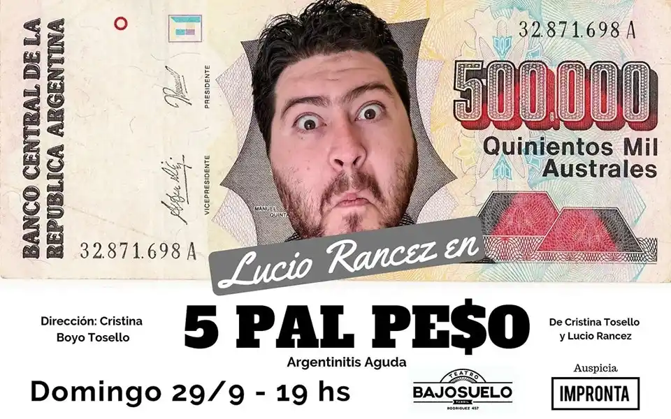 Mañana a las 19, el actor y cantante Lucio Rancez estrenará en Bajosuelo (Rodríguez 457), su unipersonal denominado “5 pal peso”. Un compendio con mucho humor sobre cómo son los argentinos. Bueno, como somos los argentinos. Una obra para reírse hasta llorar, o llorar hasta reírse. Una montaña rusa de sentimientos que nos lleva del orgullo a la vergüenza, de lo profundo a lo superfluo, del choripán a la mila de soja, sin escala. Porque todo eso forma parte del laburo diario que nos da ser argentinos. Alzamos la bandera y nos la bancamos, aunque siempre nos falten… 5 pal peso. Dirección Cristina Boyo Tosello. Operación técnica Sebastián Napoleón. Estreno mañana 29 de septiembre a las 19. Entradas anticipadas en Teatro Bajosuelo, Rodríguez 457.