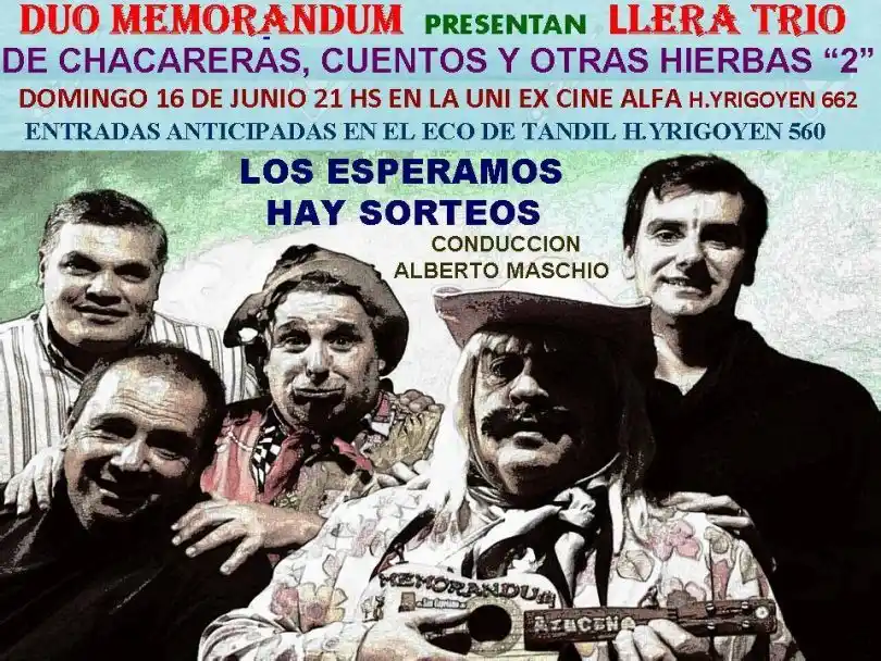Este domingo, 16 de junio, a partir de las 21 en el Auditórium del Centro Cultural Universitario, ( Yrigoyen 662), se presentará el musical y show de humor denominado “De chacareras y otras hierbas 2” , con la actuación del Llera Trío y el consagrado dúo tandilense Memorándum.
