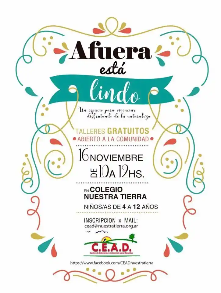 Este sábado de 10 a 12 se llevará a cabo una nueva edición de la jornada “Afuera está lindo”, organizada por el CEAD -Centro de Educación Ambiental para Docentes- perteneciente a la Asociación Civil Nuestra Tierra.