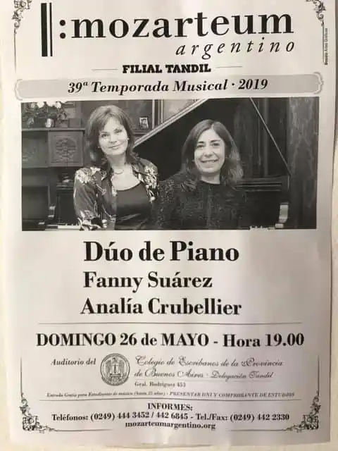 El primer concierto del año del Mozarteum Filial Tandil será este domingo a las 19 en las instalaciones del Colegio de Escribanos (Rodríguez 453). Actuarán Fanny Suárez- Analía Crubellier- Dúo De Piano. Abonos y entradas en venta en el Hostal de la Sierra, teléfono (0249) 442-2330; 442-5025.