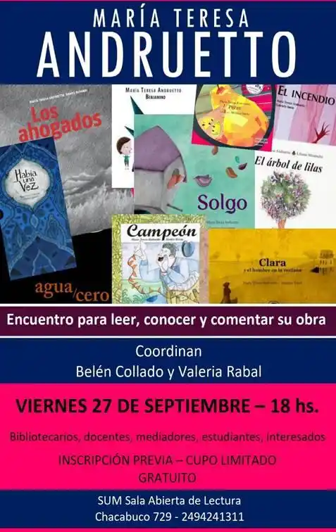 Esta tarde desde las 18 en la Sala Abierta de Lectura situada en Chacabuco 729, se llevará a cabo un encuentro para leer, conocer y comentar la obra de María Teresa Andruetto. Coordinan Belén Collado y Valeria Rabal. Cupo limitado.