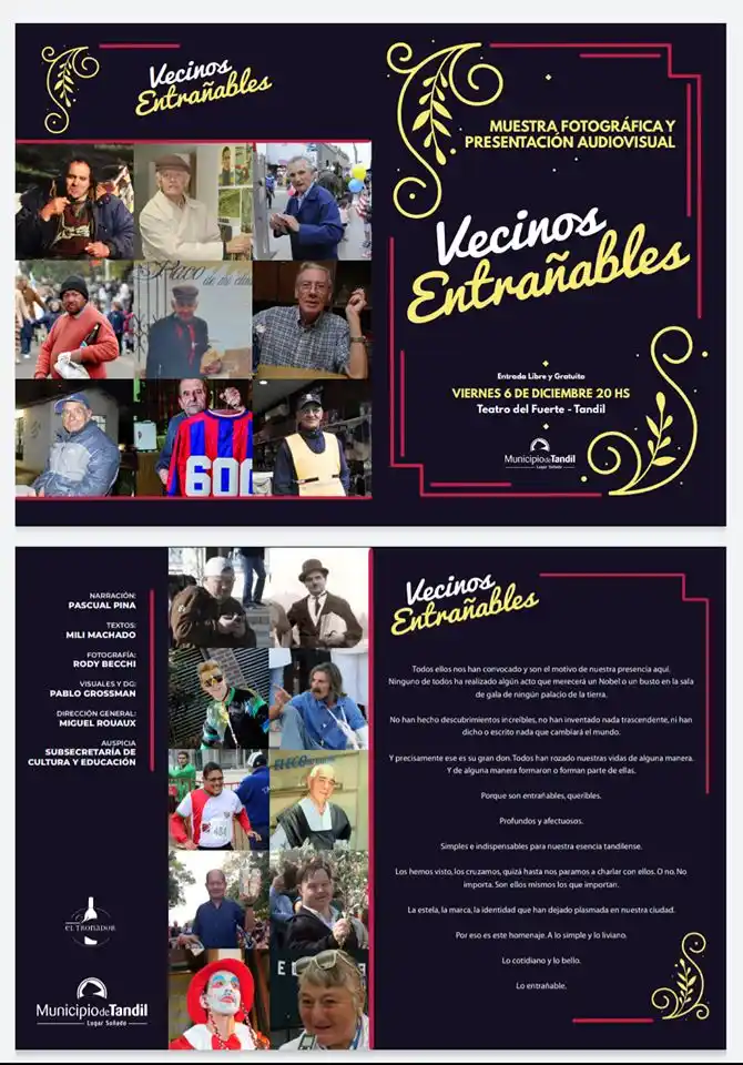 Con narración de Pascual Pina, textos de Mili Machado, fotografía de Rody Becchi, visuales y DG de Pablo Grossman, bajo la dirección general de Miguel Rouaux, “Vecinos entrañables” es un homenaje a lo simple y lo liviano, lo cotidiano y lo bello. Lo entrañable.