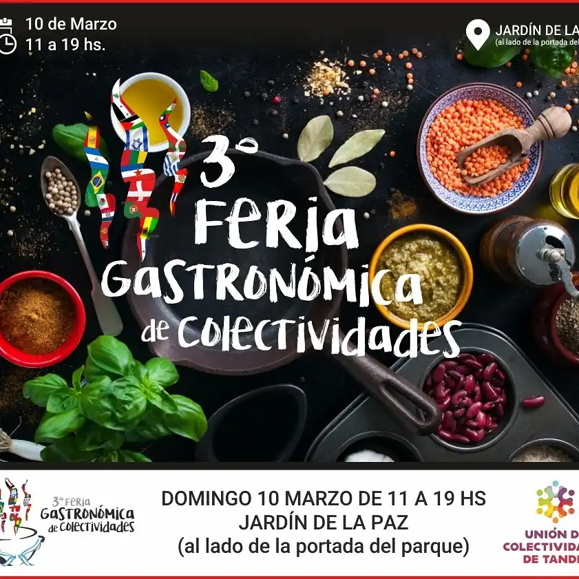 Este domingo desde las 11 y hasta las 19, se realizará la denominada “Tercer Feria Gastronómica de Colectividades” en el Jardín de la Paz (ubicado al lado de la portada del Parque independencia). El evento es organizado por la Unión de Colectividades de Tandil, estando representados cada uno de los países con una variada oferta gastronómica.