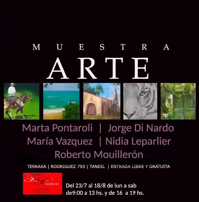 Se encuentra en galería la nueva micro exposición de Arte de alumnos del Taller de Christian Vogrich. En esta oportunidad se podrán ver pinturas en óleo como así también dibujos. Este ciclo de exposiciones viene desarrollándose desde hace varios años con la coordinación de Vogrich y la producción de sus alumnos, gracias a la gentileza de la gente de Terraxa, que muy amablemente brinda su espacio para poder darle la oportunidad a artistas que vienen trabajando desde hace varios años como así también estimulando a quienes están dando sus primeros pasos en el arte y poder de este modo exhibir sus trabajos públicamente. La muestra puede visitarse en Rodríguez 793, hasta el 18 de agosto, de lunes a viernes de 9 a 13 y de 16 a 19, con entrada libre y gratuita.