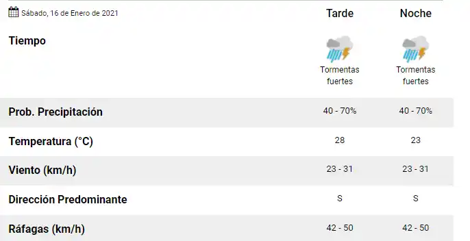 Accedé a las últimas noticias desde tu emailSegún los datos del Servicio Meteorológico Nacional, este sábado la temperatura mínima en la ciudad será de 19ºC y la máxima de 28ºC, y se anuncian fuertes tormentas para la tarde y noche. Además, se esperan vientos con ráfagas que podrían alcanzar hasta 50 km/h.