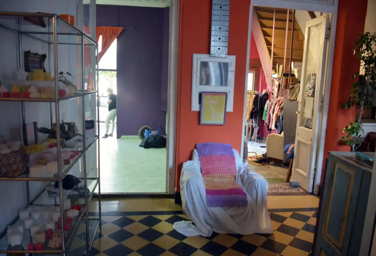 En paralelo, una feria americana permanente, abierta a la calle, suma algún ingreso para solventar los gastos, como así también la cantina. Antes del patio se encuentra la cocina, donde funciona el emprendimiento de alimentos saludables El Ombligo.