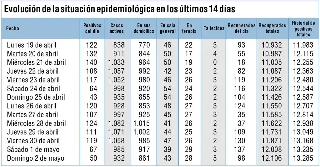 La ocupación de camas de terapia sigue siendo muy alta, con 28 pacientes internados en el área de cuidados intensivos o intermedios. Hubo 50 nuevos contagios y se procesaron 86 muestras.