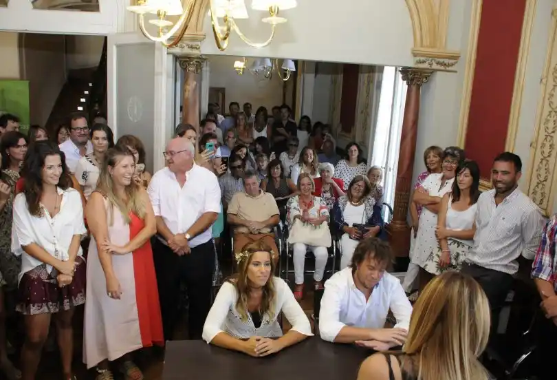 Sofía Lasarte y Federico Rampoldi celebraron junto a una multitud que se acercó a la Casa de la Cultura para acompañarlos en este momento trascendental para sus vidas. La particularidad es que no se inscribieron en el programa, pero como una de las parejas elegidas decidió no presentarse, el Registro Civil se comunicó con ellos -que tenían fecha de unión el 1 de febrero- para proponerles trasladar la ceremonia al insigne espacio.