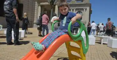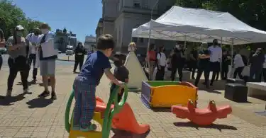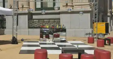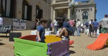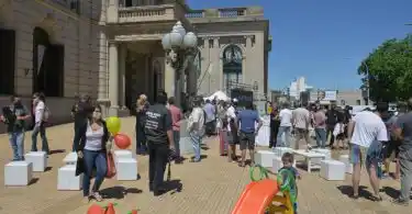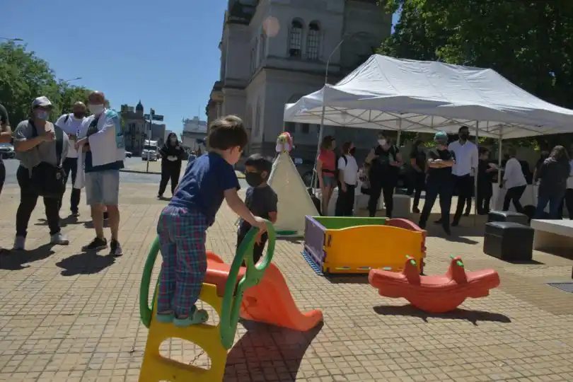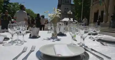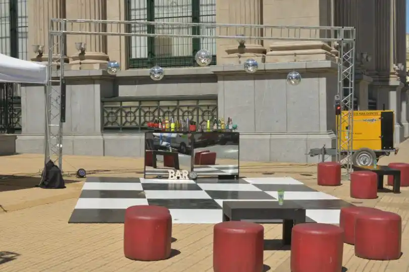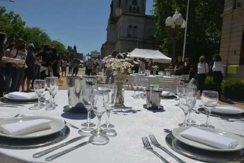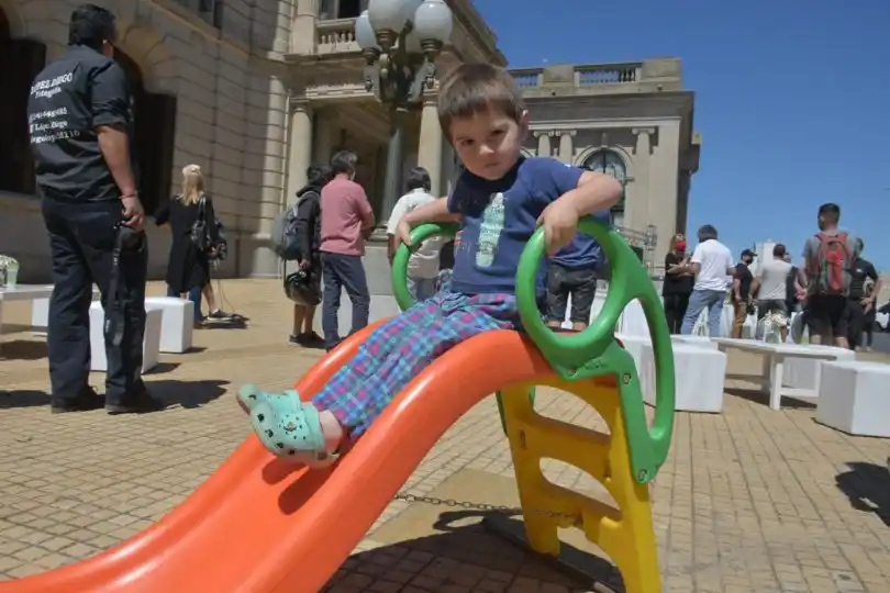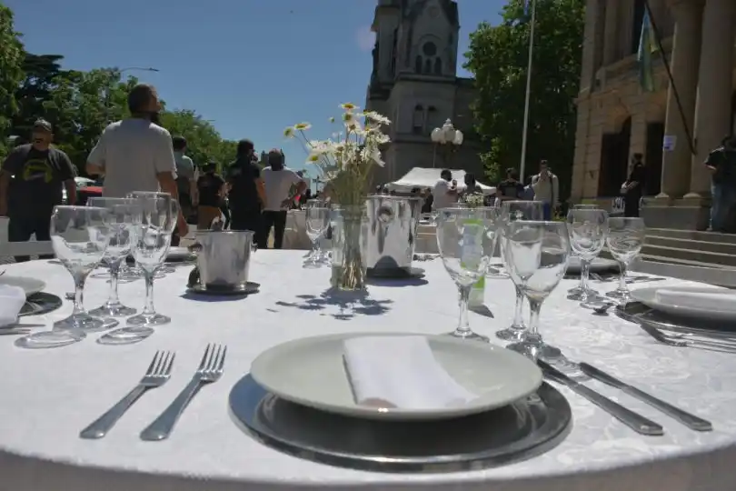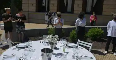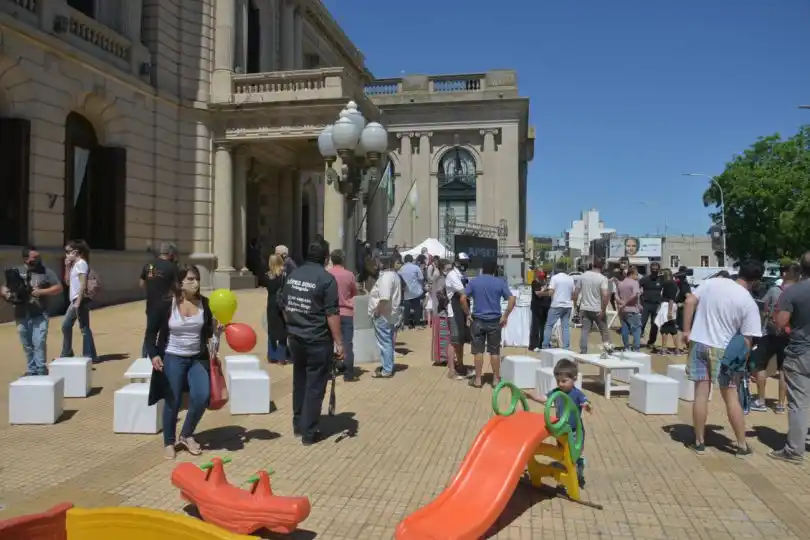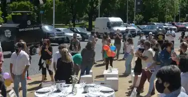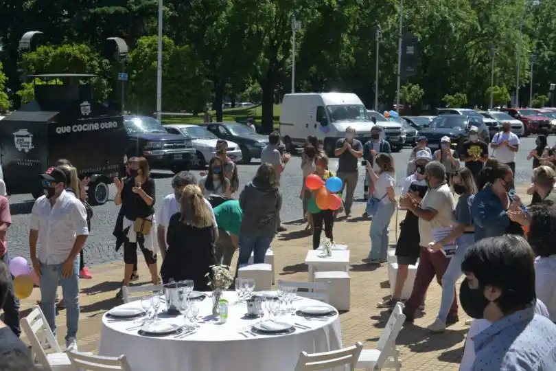 Allí los esperaba otra parte de los trabajadores de eventos, que habían ambientado toda la vereda frente al Palacio Municipal con mesas y sillas vestidas, copas, centros de mesas, espacio de juegos para niños, pantalla gigante, barra y un sector que simuló ser la zona de baile.