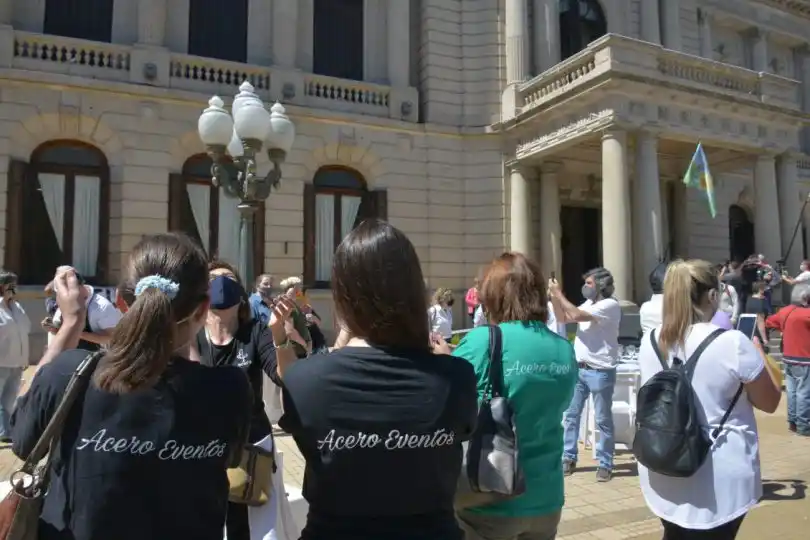 La manifestación de los trabajadores nucleados en Apset comenzó con una caravana y terminó simulando una fiesta en las puertas del Municipio. Entregaron un petitorio al Ejecutivo y fueron habilitados para volver a partir de la semana que viene, pero todavía se evalúan condiciones. Ocho meses sin ingresos, aseguraron que los eventos controlados son menos riesgosos que los clandestinos.