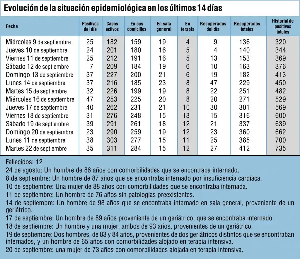 Actualmente hay 284 personas que cursan la enfermedad en sus domicilios, 15 permanecen internadas en sala general y 12 en terapia intensiva o intermedia, una más en comparación con el lunes.