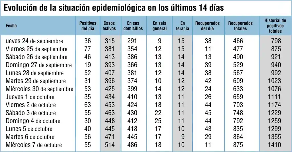 En tanto, confirmó 55 nuevos contagios y la cantidad de casos activos superó la barrera de los 500 ya que son 514 las personas que cursan la enfermedad en la ciudad, dos son residentes de María Ignacia (Vela) y tres de Gardey, uno más en comparación con el martes.
