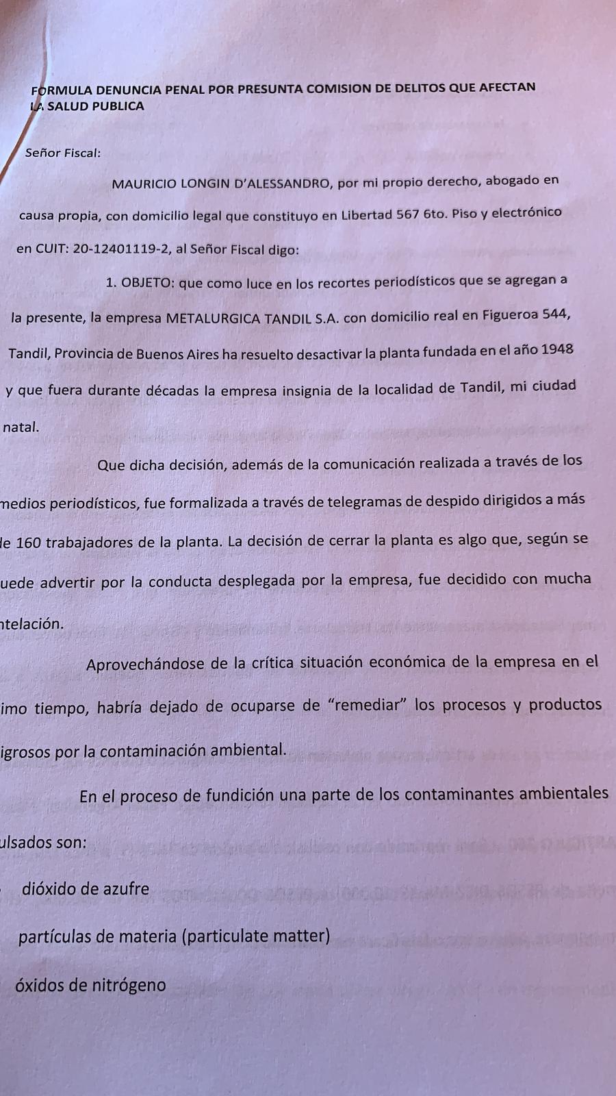 El concejal y abogado Mauricio D’Alessandro había adelantado acciones judiciales en torno a la drástica decisión de Metalúrgica Tandil. Al respecto, en las últimas horas trascendió el tenor de la presentación que realizó el edil, pidiendo que se decrete una medida cautelar de no innovar prevista en los artículos 18, 63 y supletorios de la ley de procedimientos laboral de la Provincia de Buenos Aires contra Metalurgica Tandil S.A., “ordenando en forma inmediata dejar sin efecto los despidos cursados respecto de todos los trabajadores de la planta Tandil (…)hasta tanto se ejecute el procedimiento de crisis establecido en la Ley 24013 de aplicación obligatoria en el caso”.