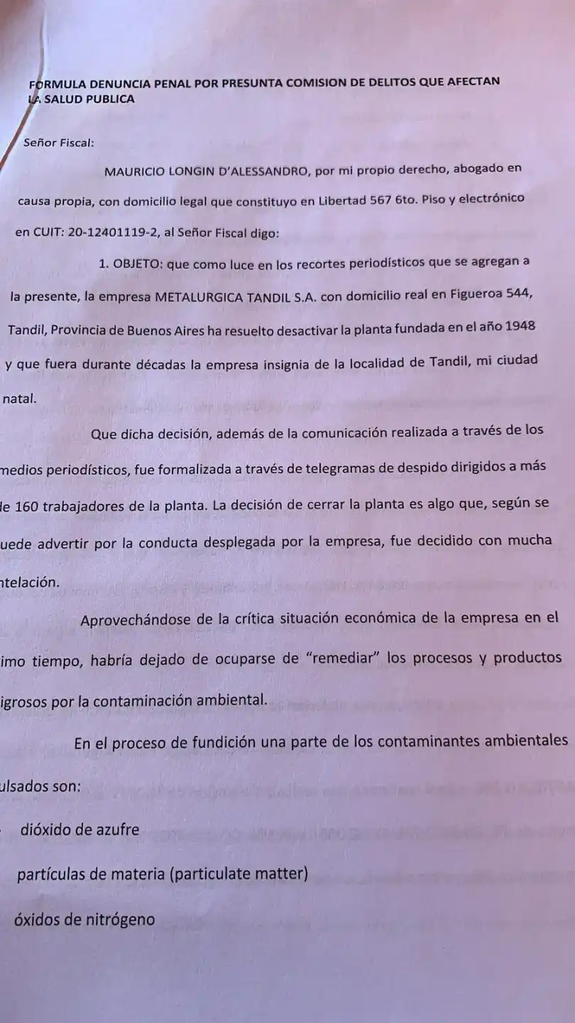 D’Alessandro presentó una medida cautelar y denuncia penal por el pasivo ambiental