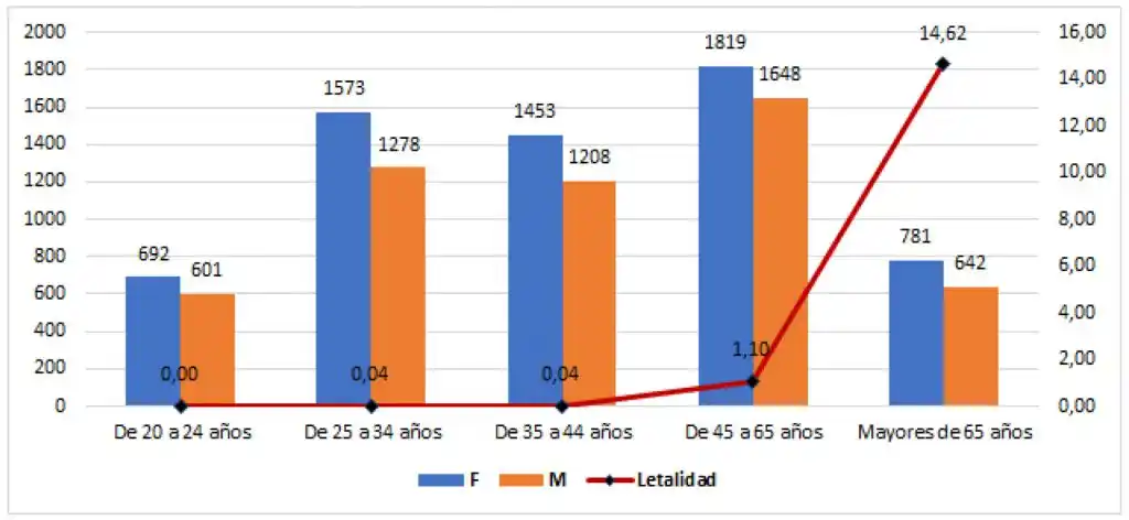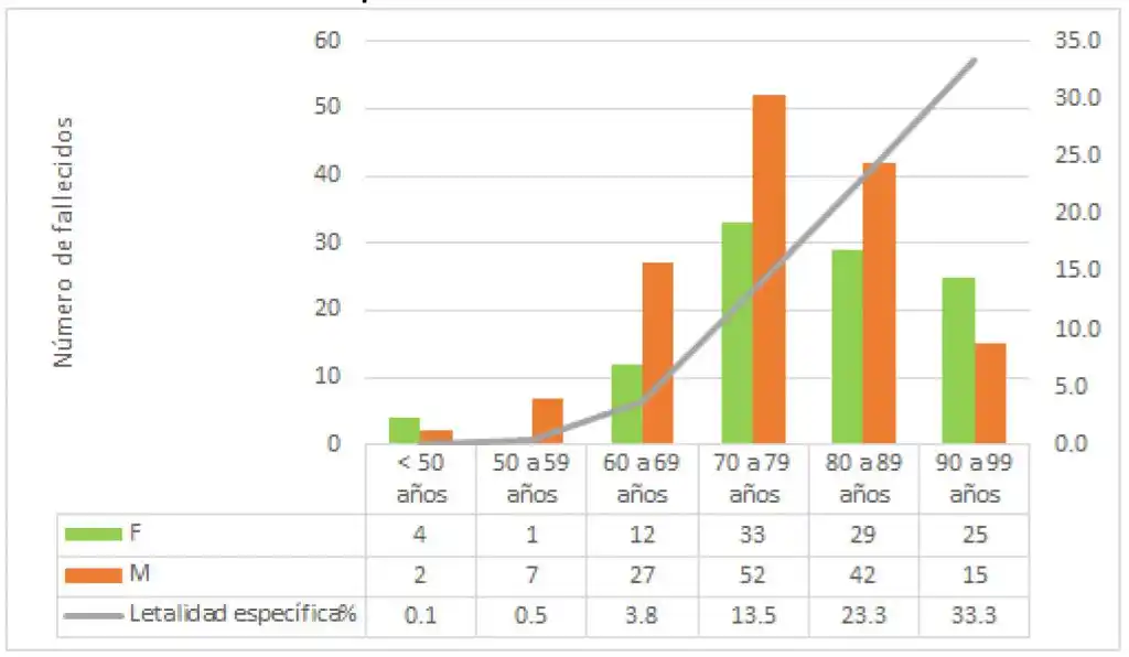 Además, se evaluó la letalidad teniendo en cuenta a los grupos etarios y el sexo. El mayor número de fallecidos se registró entre los 70 a 79 años (con 85), con una tasa de letalidad específica del 13,5 por ciento, seguido por el grupo de 80 a 89 años (71 casos) con una tasa de letalidad específica del 23,3 por ciento y el grupo de 90 a 99 años (40 personas) con una tasa de letalidad específica del 33,3 por ciento.