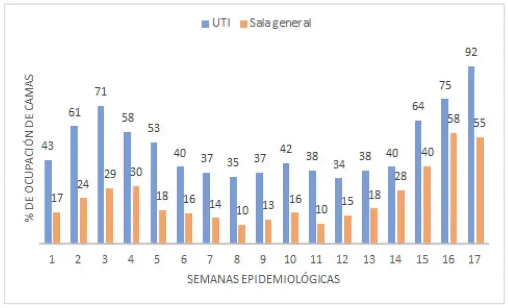 En cuanto a la ocupación de camas por casos de Covid-19, la semana 17 presentó el nivel más alto, con 92 por ciento en Unidades de Terapia Intensiva y 55 por ciento en sala general. En tanto, en la semana 16 fue del 75 por ciento en UTI y el 58 por ciento en sala general, y en la semana 15 era del 64 y 40 por ciento respectivamente.