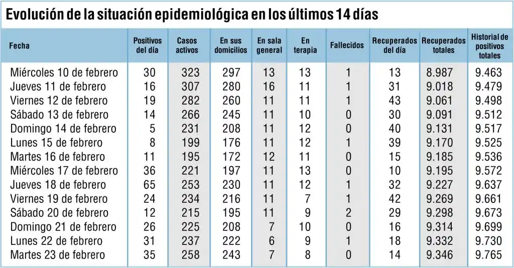 Además, se tomaron muestras a 22 personas y 14 recibieron el alta médica. Con estos números, pasó de 237 a 258 el total de casos activos. En tanto, 243 infectados no requieren internación y se recuperan en sus domicilios.