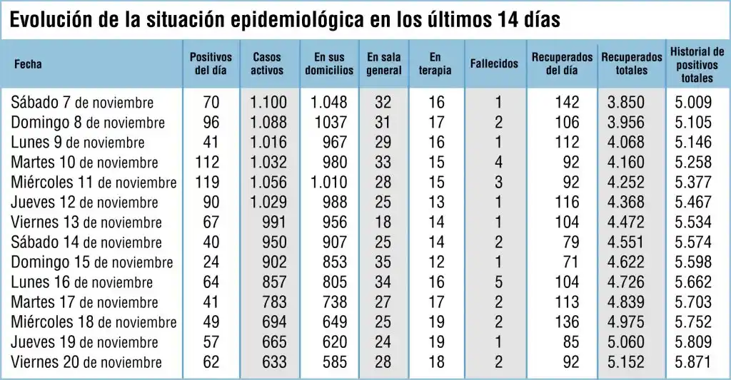 Durante la jornada, 92 personas recibieron el alta y la cantidad de casos activos es de 633, de los cuales 585 cursan la enfermedad en sus domicilios. Además, hay 18 pacientes internados en terapia intensiva o intermedia, 28 en sala general y dos en alojamientos no hospitalarios.