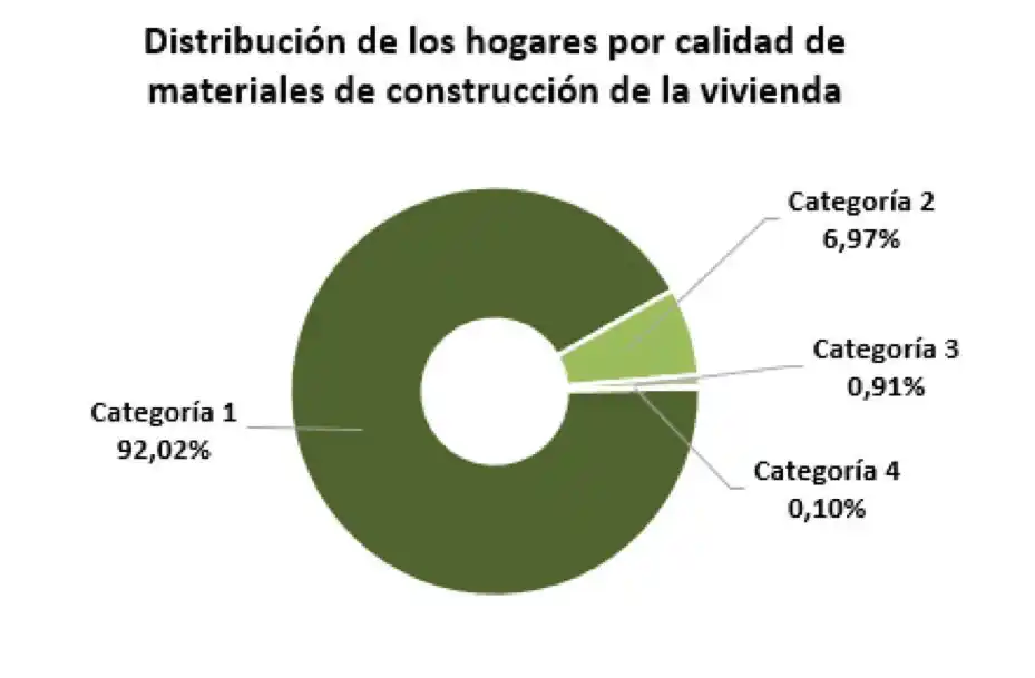 La categoría uno de este indicador corresponde a las viviendas que presentan materiales sólidos y resistentes en los pisos interiores (cemento alisado, cerámica, baldosa, mosaico, mármol, madera, goma, alfombrado, cemento o ladrillo fijo), cuentan con revoque en las paredes exteriores y cielorraso en el techo.