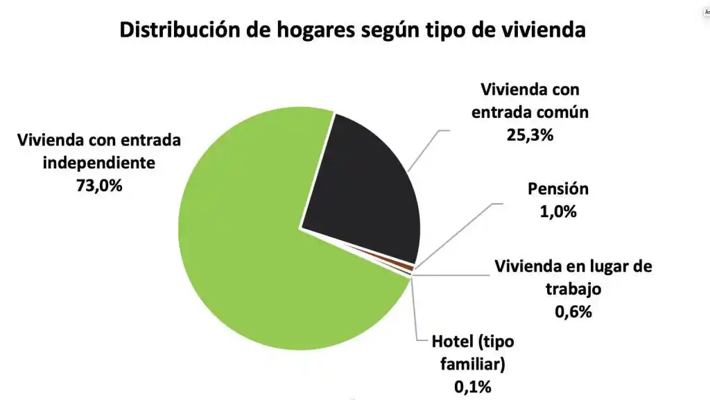 Por otro lado, de acuerdo al informe, el 73 por ciento de las personas vive en casas con salida directa al exterior, mientras que el 25,3 por ciento reside en viviendas con entrada común (departamentos en edificio o PH, o casas que comparten terreno).